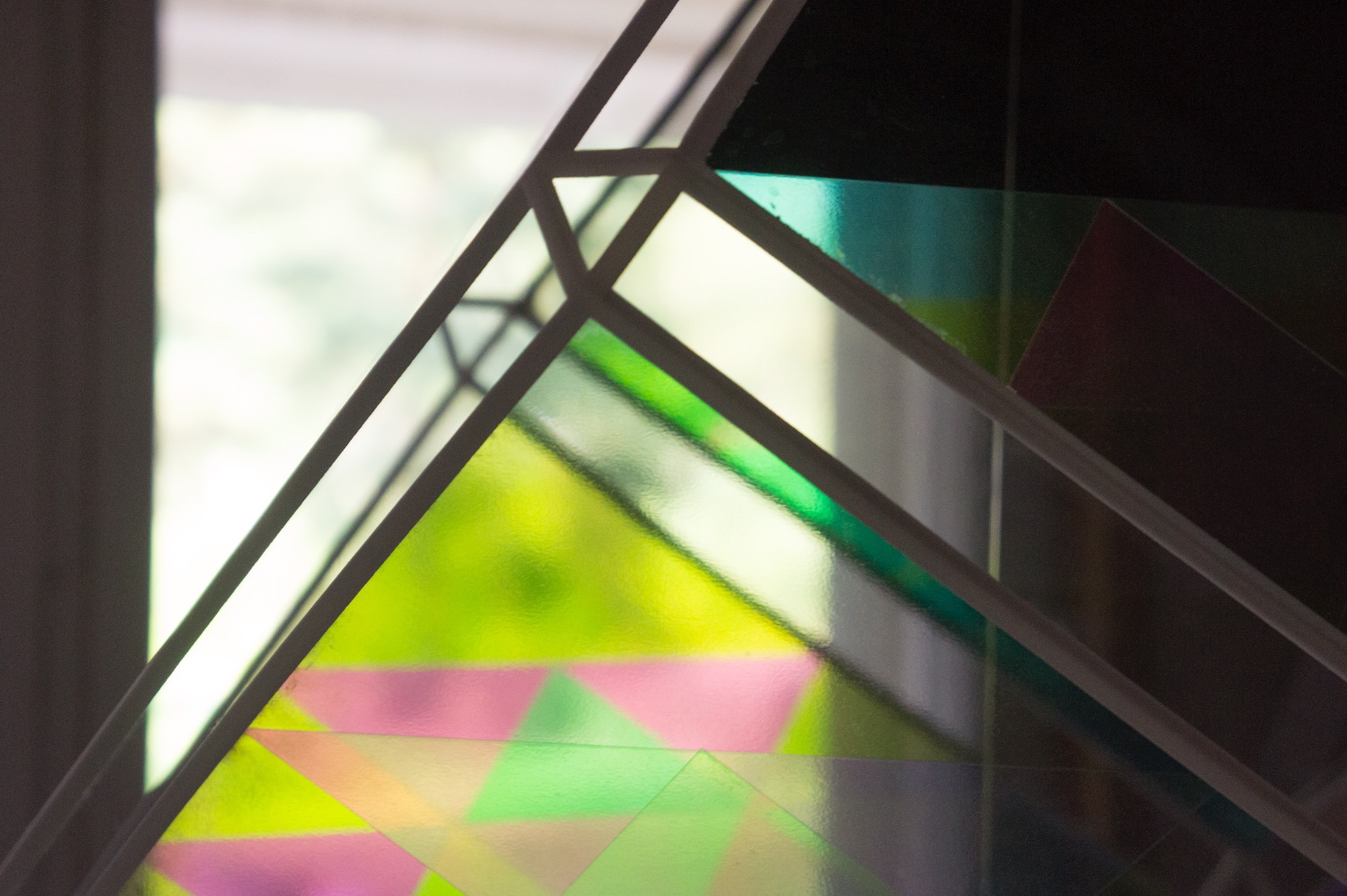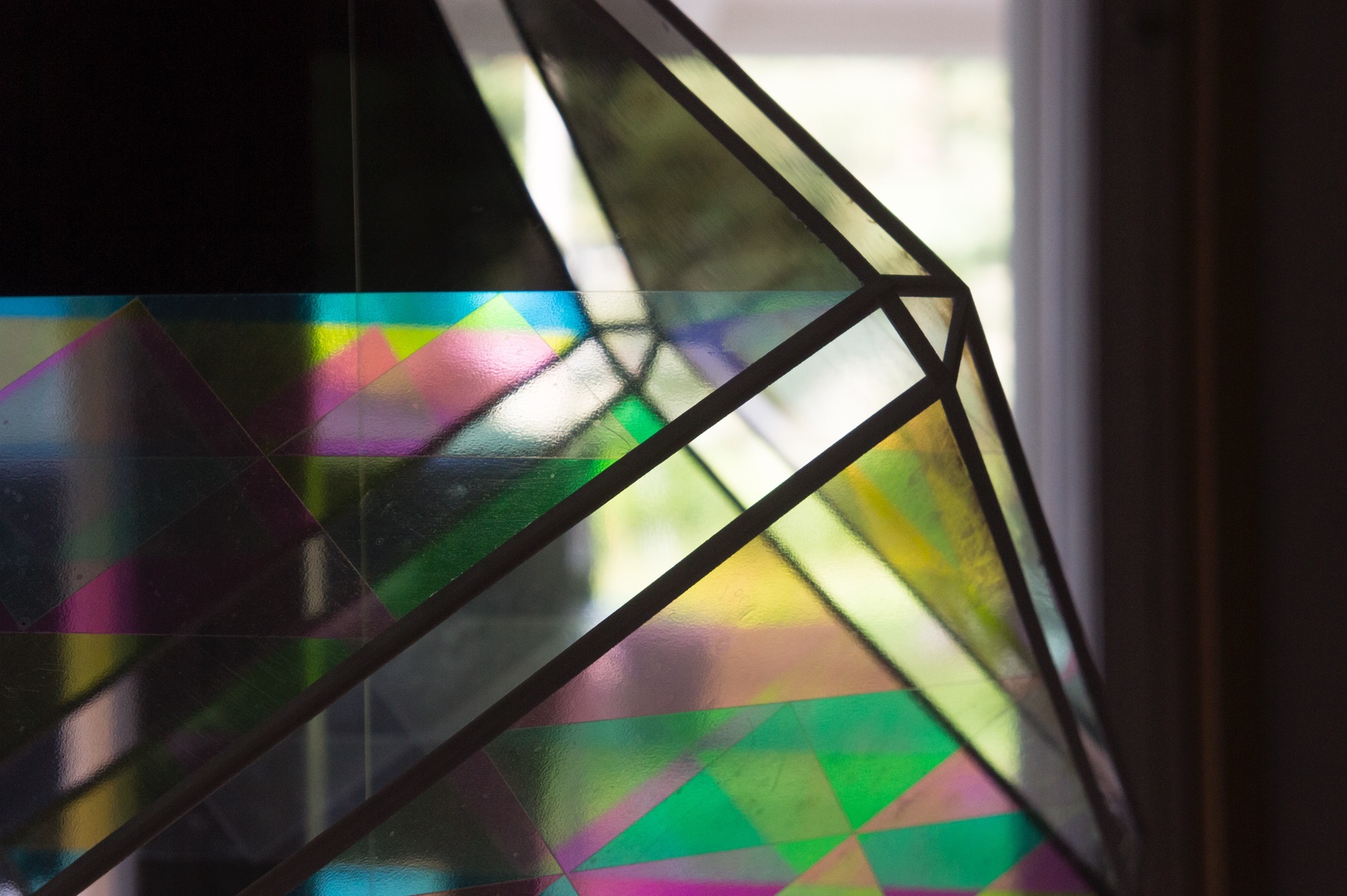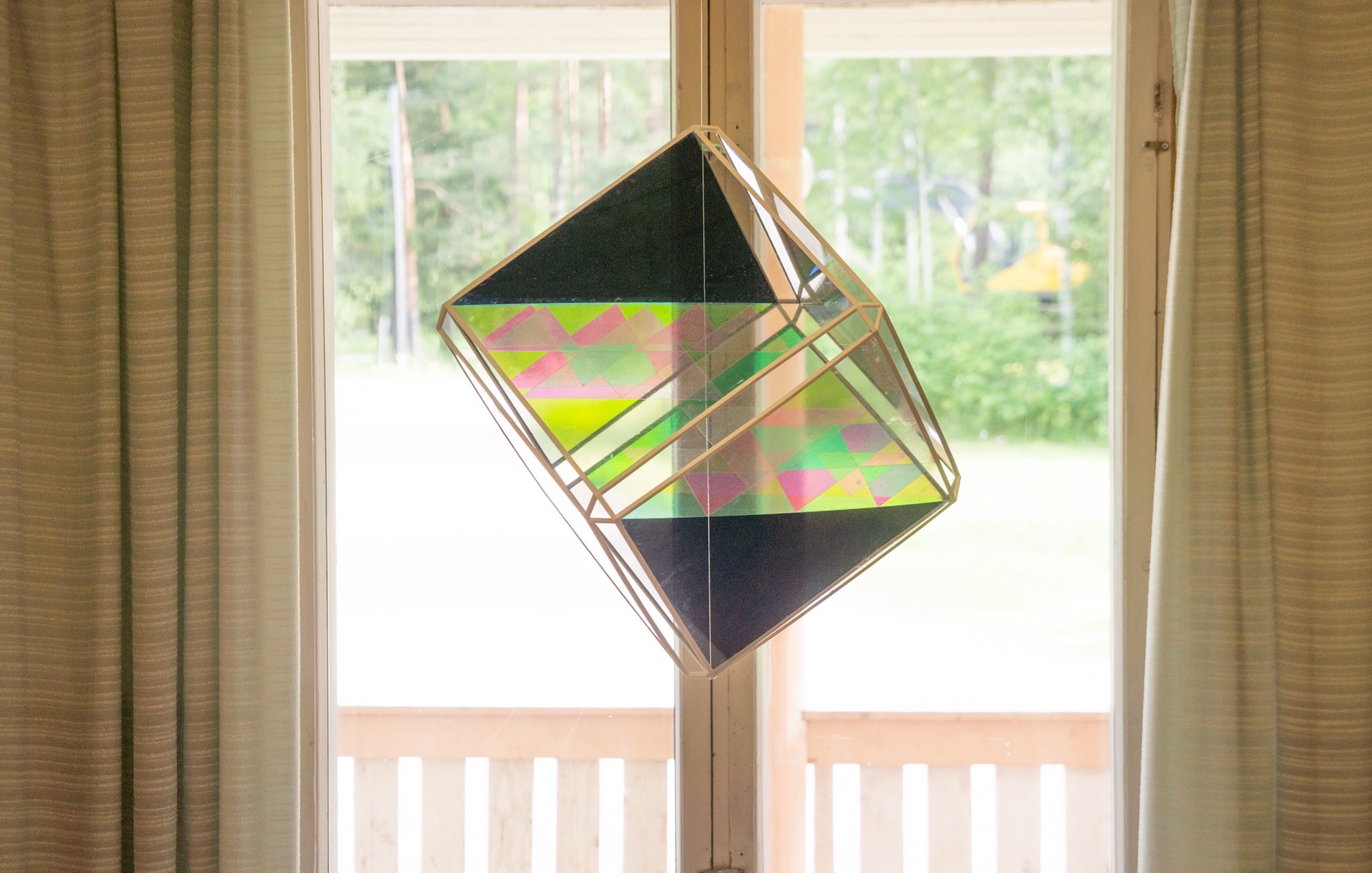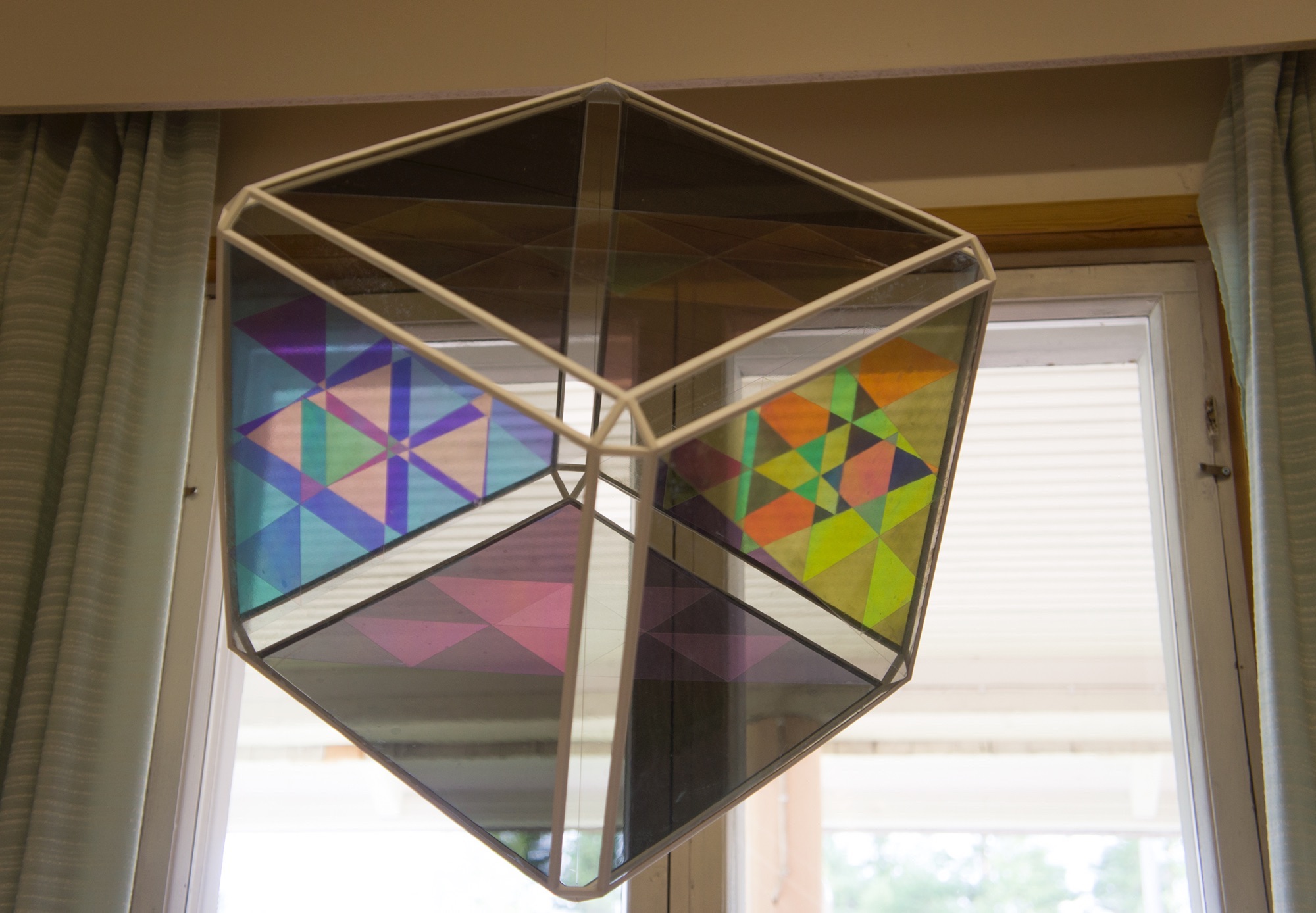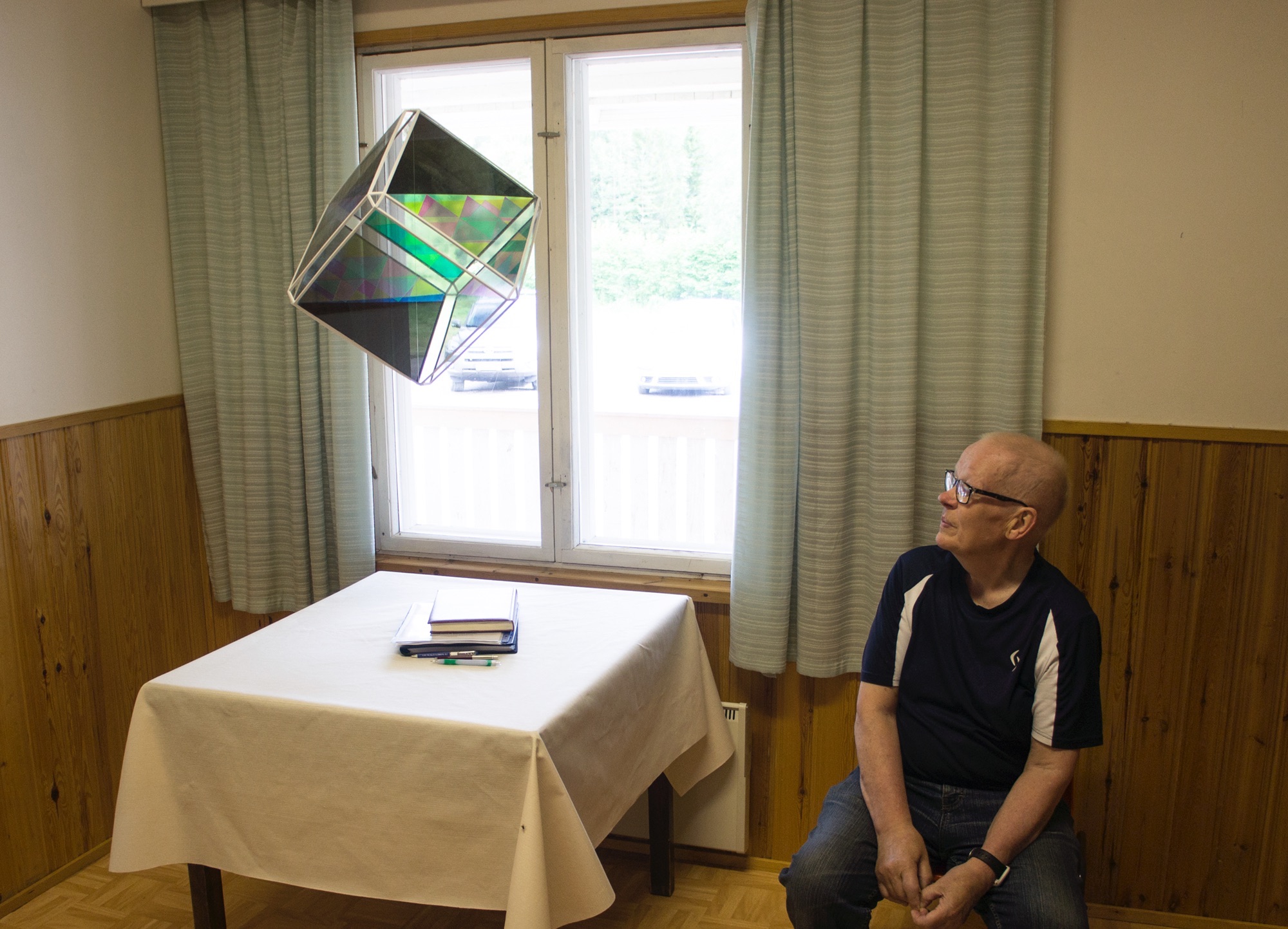 In the community house, a former school, where the local community gathers together to work on traditional handicrafts such as birch bark weaving, textiles etc. a contemporary adaptation of "himmeli", a traditional rye straw decoration artform greets the visitors in the hallway. The sides of the sculpture are polarised and waveplated, creating geometric patterns of colourful light.