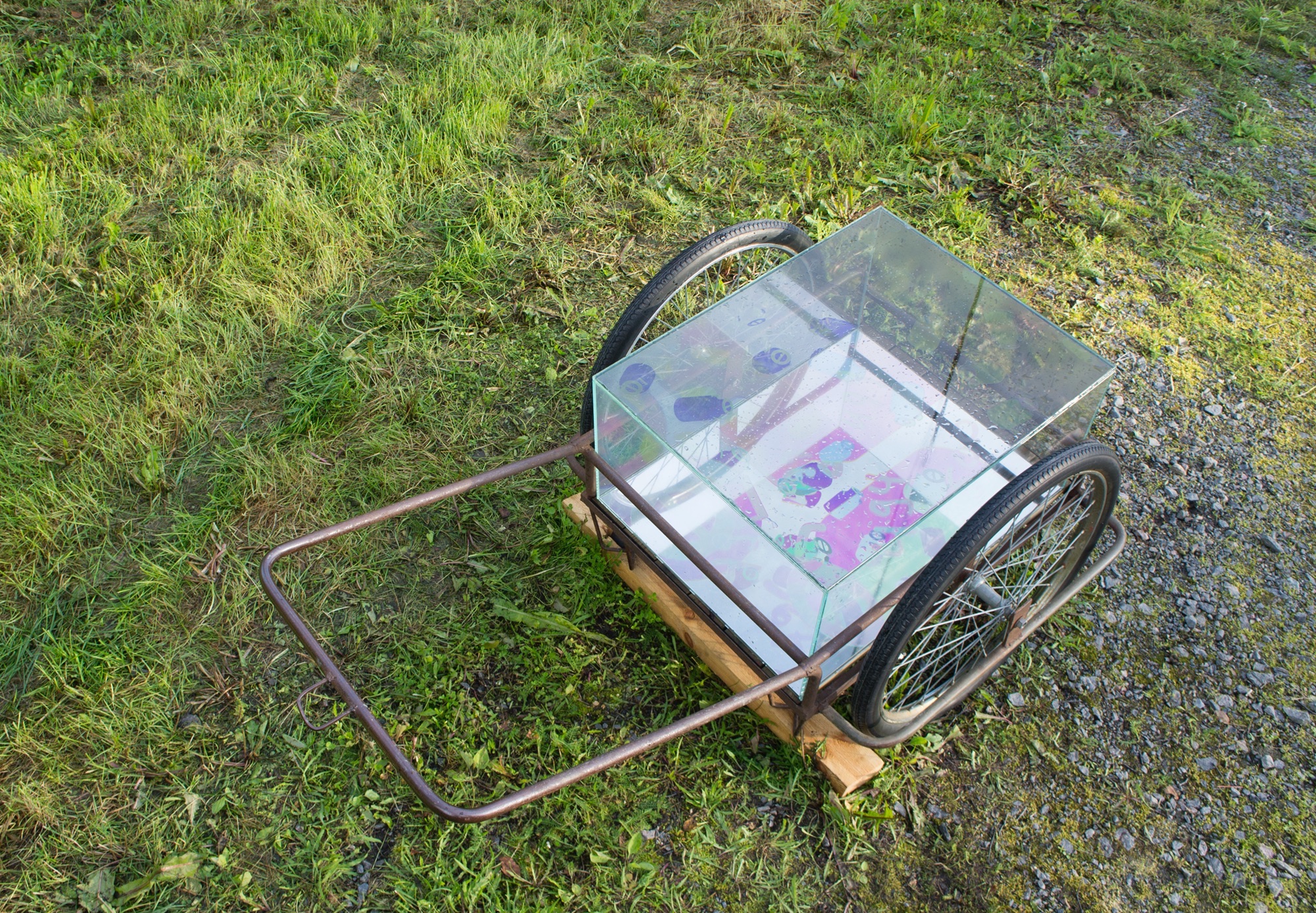 In a place where the milk collection platform used to be, a lone milk cart is standing alone. Inside churns and the churn numbers from each house floats in time and space.
